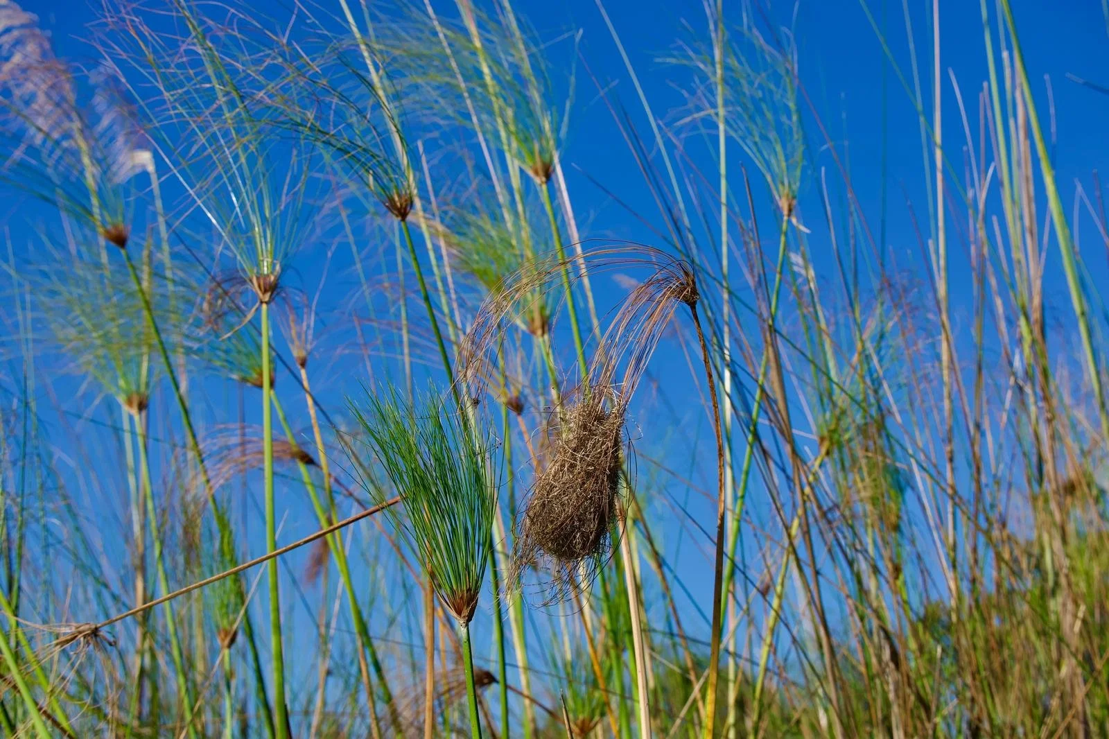 Bird nest hanging on papyrus reeds in the Okavango Delta, highlighting the Delta’s unique wetland habitat.